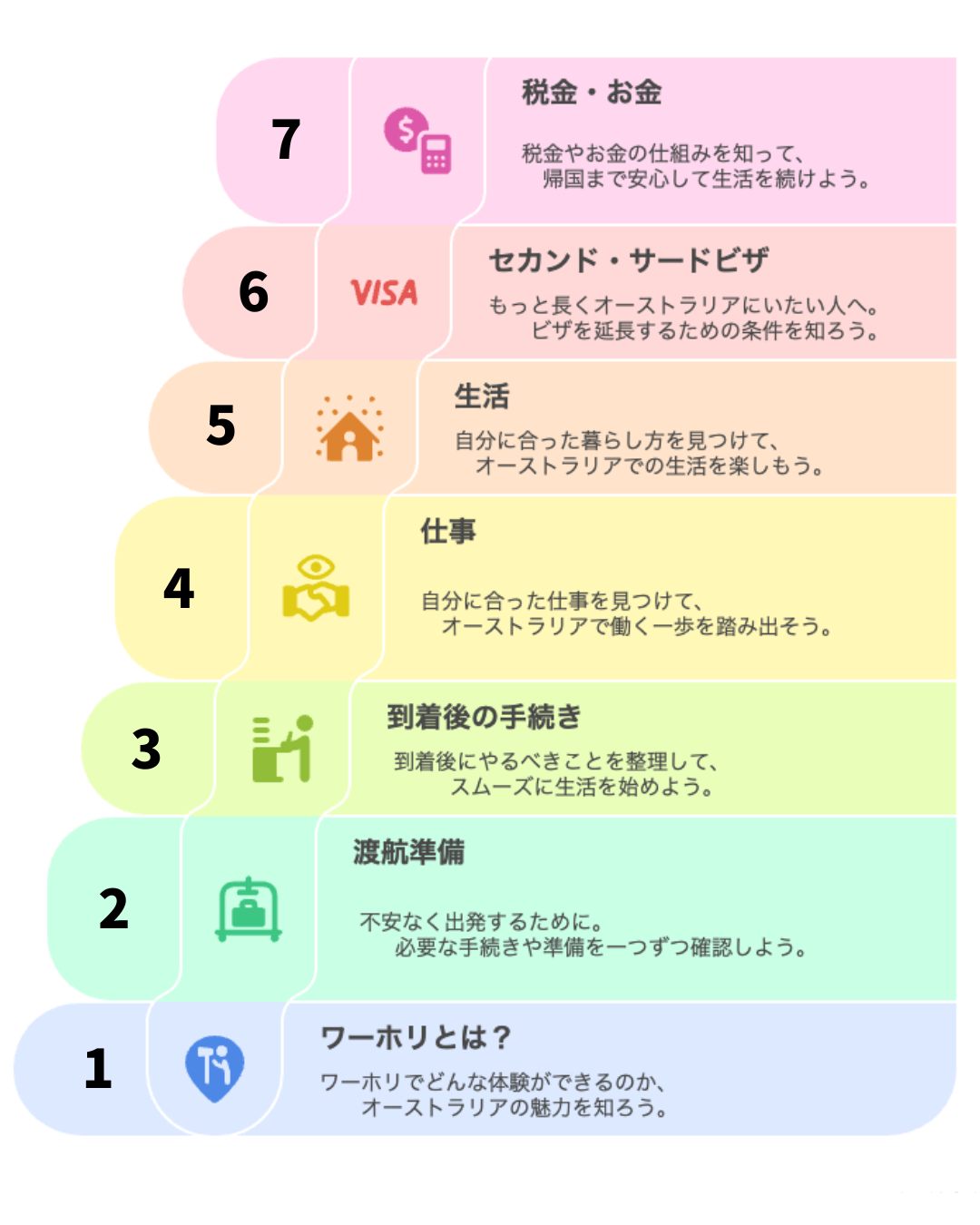 このステップでは、銀行口座の開設、税務番号(TFN)の取得、スマホのSIM契約、公共交通に関する情報など、到着直後にやるべきことをわかりやすく整理しています。