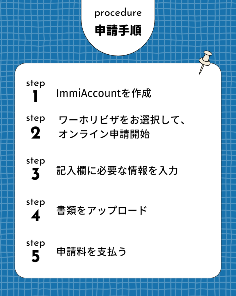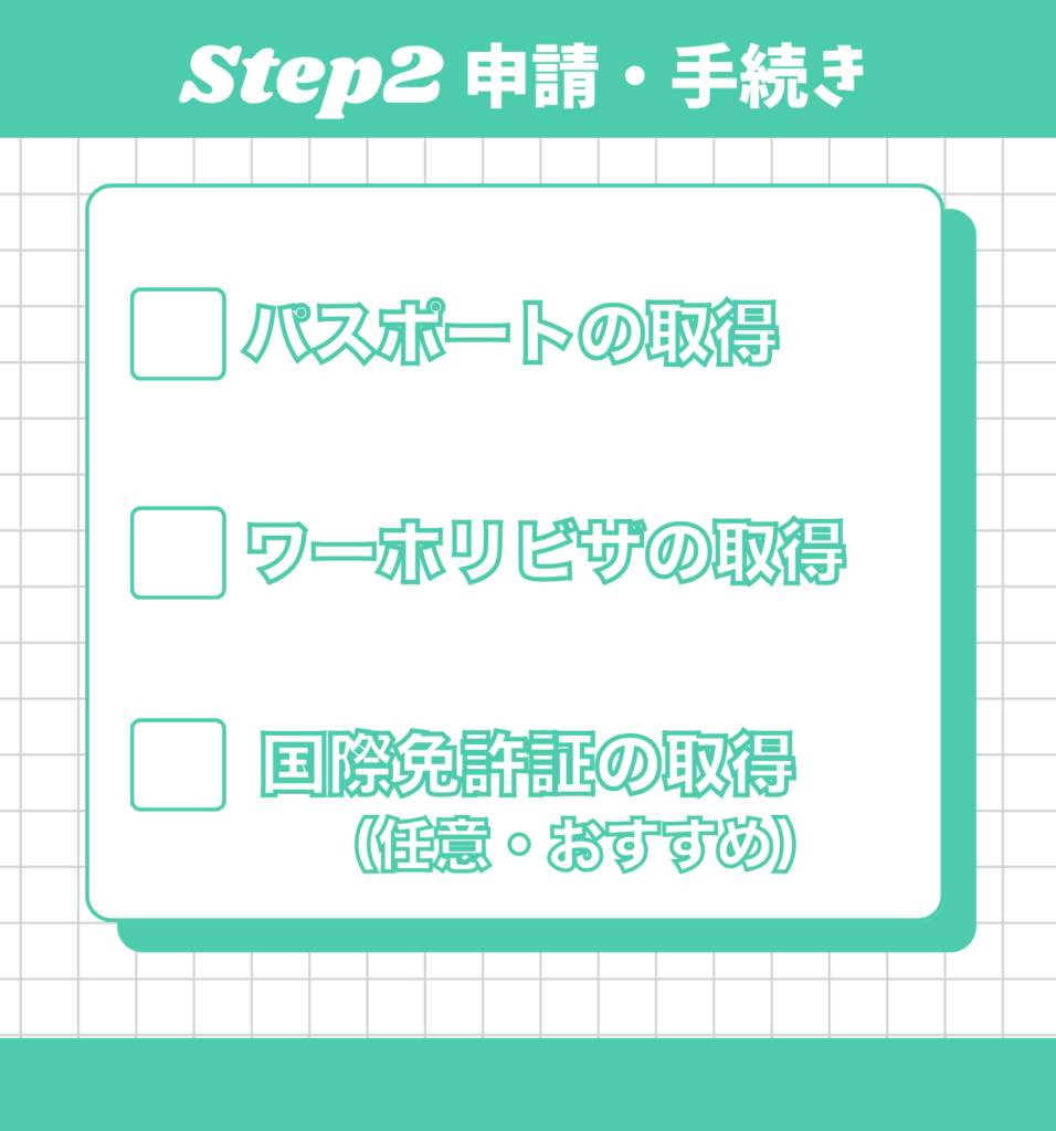 このステップでは、ワーキングホリデーに必要な各種申請や手続きを進めていきます。