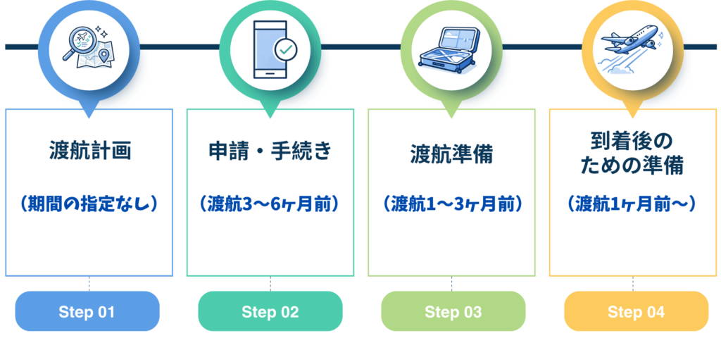 このロードマップでは、渡航前にやるべきことを4つのステップに分けてご紹介します。