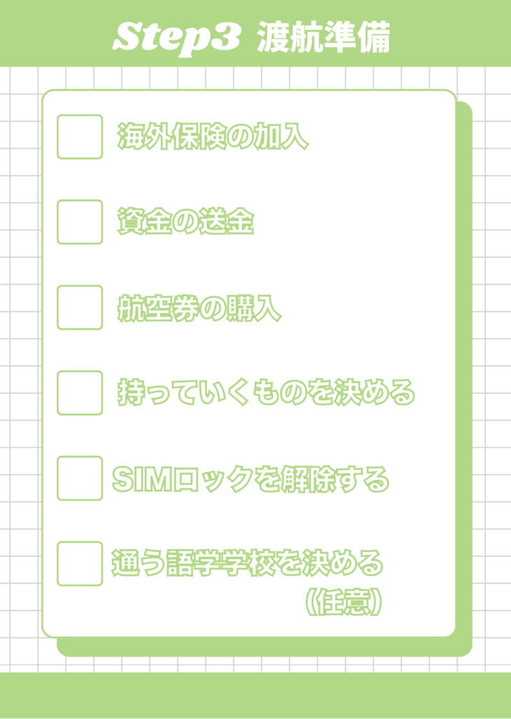 このステップでは、いよいよ出発に向けて生活面・お金・持ち物などの準備を本格的に進めていきます。