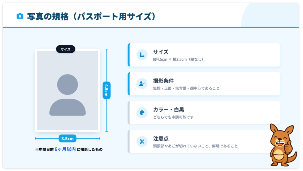 申請日前6か月以内に撮影されたものであれば、白黒・カラーどちらでもOKです。